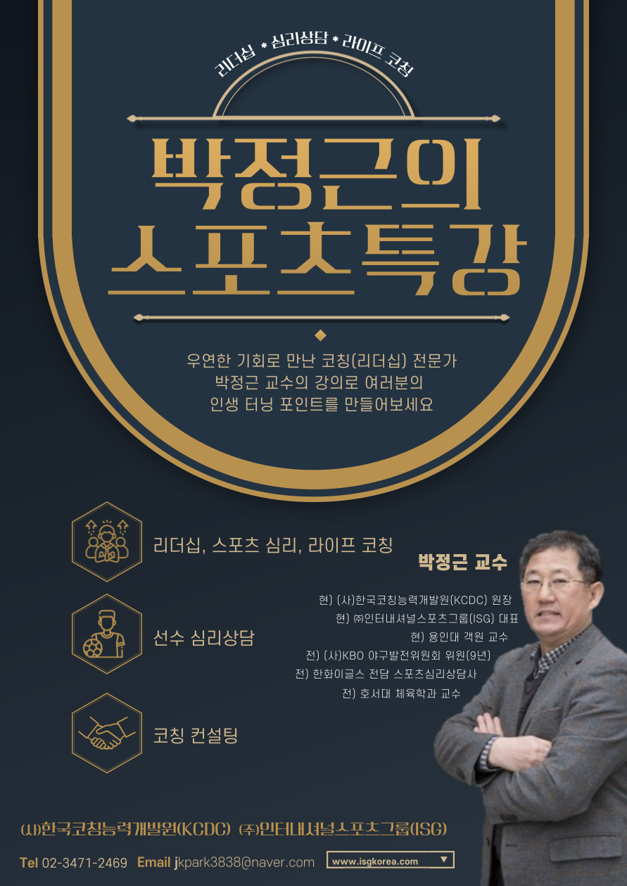 ◾ (사)한국코칭능력개발원(KCDC) 박정근 원장님의 특강을 실시합니다. 우연한 기회로 만난 코칭(리더십) 전문가 박정근 교수의 강의로 여러분의 인생 터닝 포인트를 만들어보세요!