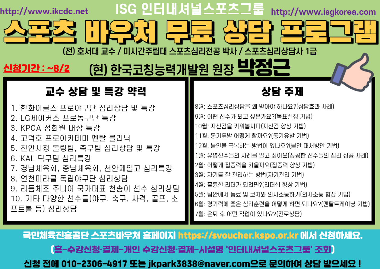 ㈜인터내셔널스포츠그룹(ISG)과 (사)한국코칭능력개발원(KCDC)에서는 초.중.고 엘리트 선수들 중에서 경제적으로 어려운 선수(기초생활수급가정 유.청소년 대상)를 대상으로 무료스포츠심리상담을 실시한다.